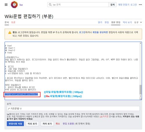 - 참고로 문서작성시 파일명을 미리 작성하면, 읽기 모드에서 보면, 빨간색(링크 깨짐 의미)으로 나타난다. 이때, 빨간색 파일이름을 클릭하고 들어가서, 파일을 올려도 된다.