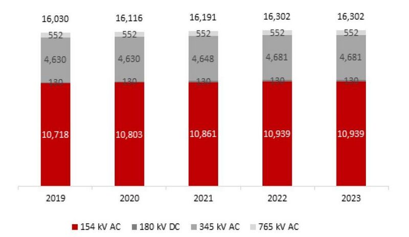 지난 5년 동안 송전선 길이는 안정적으로 유지되었으며, 연평균 성장률은 약 0.34%에 그쳤습니다.